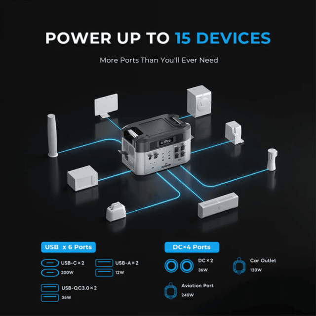 • 🔋 15 Versatile Output Ports – Includes AC, USB-C (100W), RV, and car port