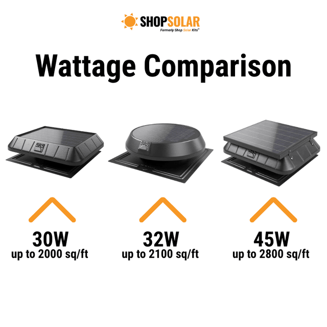 • Customizable Wattage: Choose from 30W (up to 2,000 sq/ft), 32W (up to 2,100 sq/ft), or 45W (up to 2,800 sq/ft) based on your attic size and climate.