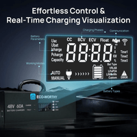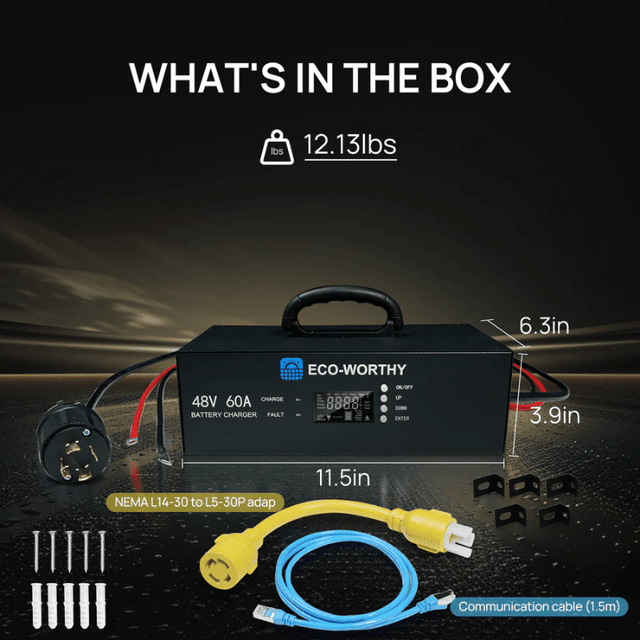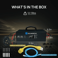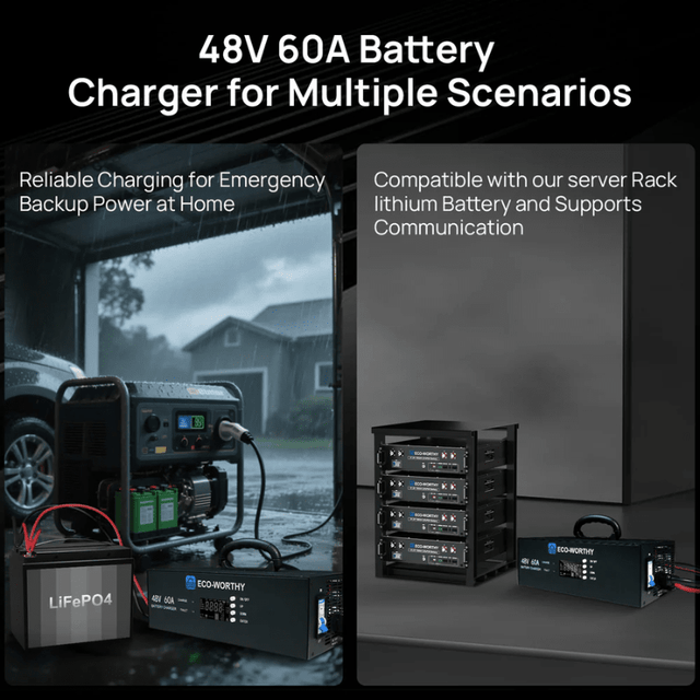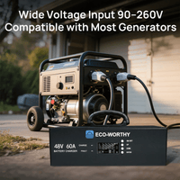 Charge your solar battery bank smarter and faster with the ECO-WORTHY 48V 60A Smart Battery Charger. Designed for flexible off-grid, backup, and hybrid systems, this AC-to-DC charger delivers precision charging for lithium and lead-acid batteries—backed by a 3-year manufacturer warranty for peace of mind.