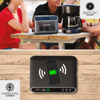 • Multiple Output Ports – Includes 2x AC (110V), 4x USB-A, 1x USB-C, 1x 12V DC port, and wireless charging pad.