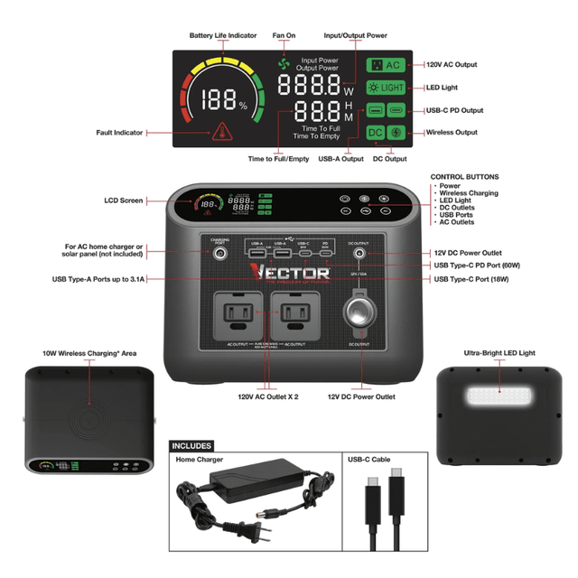 Vector 500W / 444wH Portable Power Station | VECLIPS4 | Li-Ion Battery | Wireless Charging, AC/USB/DC Outlets | Solar-Ready | 2-Year Warranty